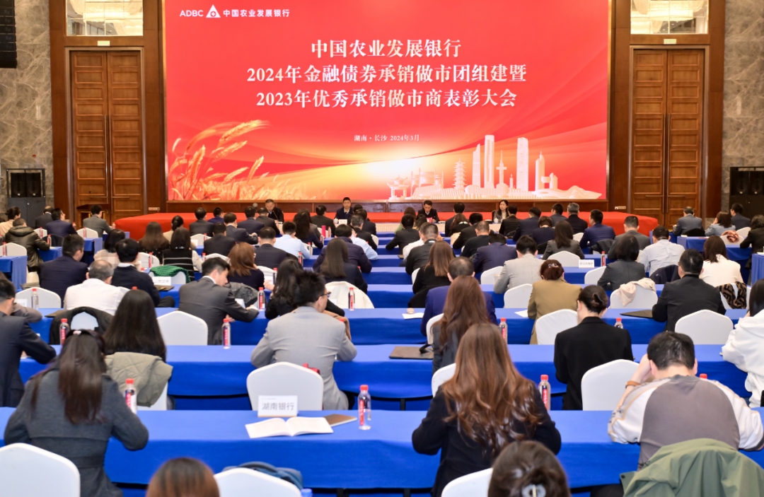 3月7日至8日,農(nóng)發(fā)行召開2024年金融債券承銷做市團組建暨2023年優(yōu)秀承銷做市商表彰大會,通報2023年度農(nóng)發(fā)行業(yè)務(wù)經(jīng)營情況和債券發(fā)行情況,表彰農(nóng)發(fā)債優(yōu)秀承銷做市機構(gòu)與個人??傂匈Y金部主要負責人主持會議,湖南省分行、總行相關(guān)業(yè)務(wù)部室負責人參加會議。農(nóng)發(fā)債承銷做市團成員、基礎(chǔ)設(shè)施機構(gòu)代表和《金融時報》媒體代表等80余家機構(gòu)代表受邀參加會議。