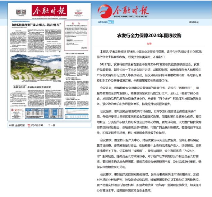 5月17日,農(nóng)發(fā)行在河北省石家莊市召開2024年夏糧收購信貸調(diào)研座談會(huì),農(nóng)發(fā)行黨委委員、副行長徐一丁出席會(huì)議并講話,戰(zhàn)略規(guī)劃部、糧棉油部負(fù)責(zé)人和夏糧主產(chǎn)區(qū)相關(guān)省級分行負(fù)責(zé)人等參加會(huì)議。會(huì)議分析研判今年夏糧收購形勢,聽取各行夏糧收購工作及開展情況匯報(bào),全面部署夏糧收購信貸工作。