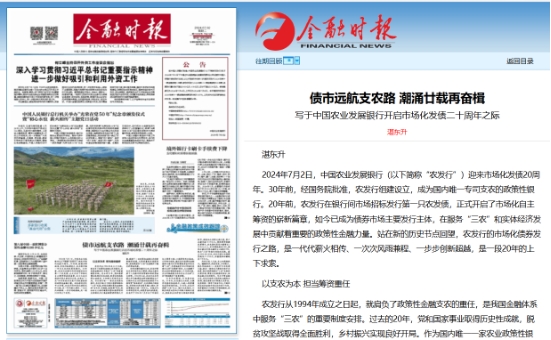 2024年7月2日,中國農(nóng)業(yè)發(fā)展銀行(以下簡稱“農(nóng)發(fā)行”)迎來市場化發(fā)債20周年。30年前,經(jīng)國務(wù)院批準(zhǔn),農(nóng)發(fā)行組建設(shè)立,成為國內(nèi)唯一專司支農(nóng)的政策性銀行。20年前,農(nóng)發(fā)行在銀行間市場招標(biāo)發(fā)行第一只農(nóng)發(fā)債,正式開啟了市場化自主籌資的嶄新篇章,如今已成為債券市場主要發(fā)行主體,在服務(wù)“三農(nóng)”和實(shí)體經(jīng)濟(jì)發(fā)展中貢獻(xiàn)著重要的政策性金融力量。站在新的歷史節(jié)點(diǎn)回望,農(nóng)發(fā)行的市場化債券發(fā)行之路,是一代代薪火相傳、一次次風(fēng)雨兼程、一步步創(chuàng)新超越,是一段20年的上下求索。