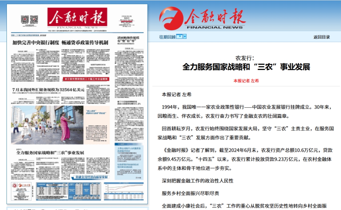 《金融時(shí)報(bào)》記者了解到,截至2024年6月末,農(nóng)發(fā)行資產(chǎn)總額10.6萬億元,貸款余額9.45萬億元?!笆奈濉币詠?,農(nóng)發(fā)行累計(jì)投放貸款9.23萬億元,在農(nóng)村金融體系中的主體和骨干地位進(jìn)一步夯實(shí)。