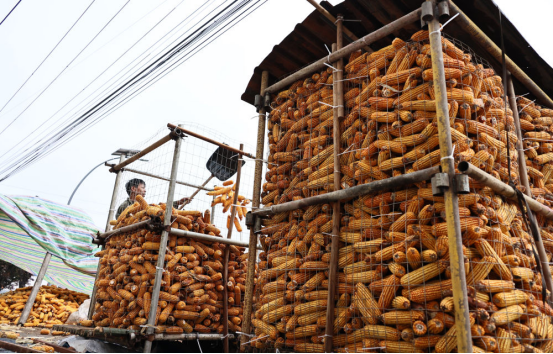 ??10月11日,山西省運(yùn)城市新絳縣澤掌鎮(zhèn)澤掌村村民抓緊降雨暫停時(shí)段將收獲的玉米上架晾曬。新華社發(fā)(高新生 攝)