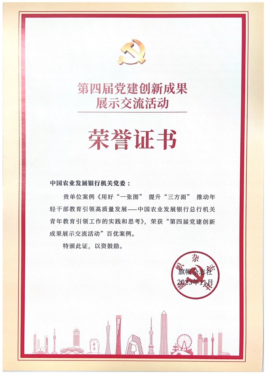 前期,第四屆黨建創(chuàng)新成果展示交流活動在深圳召開,農(nóng)發(fā)行總行機關(guān)黨委呈報參評的機關(guān)青年工作創(chuàng)新案例《用好“一張圖” 提升“三方面”推動年輕干部教育引領(lǐng)高質(zhì)量發(fā)展——中國農(nóng)業(yè)發(fā)展銀行總行機關(guān)青年教育引領(lǐng)工作的實踐和思考》,獲評第四屆黨建創(chuàng)新成果展示交流活動“百優(yōu)案例”。此次展示交流活動于2023年5月下旬啟動,共征集到中央和國家機關(guān)、?。▍^(qū)、市)、副省級城市以及企事業(yè)單位等基層黨組織報送的黨建創(chuàng)新案例503個。經(jīng)專家評審、現(xiàn)場展示、提問答辯,評選出“十佳案例”40個、“百優(yōu)案例”116個,“優(yōu)秀組織獎”10個。