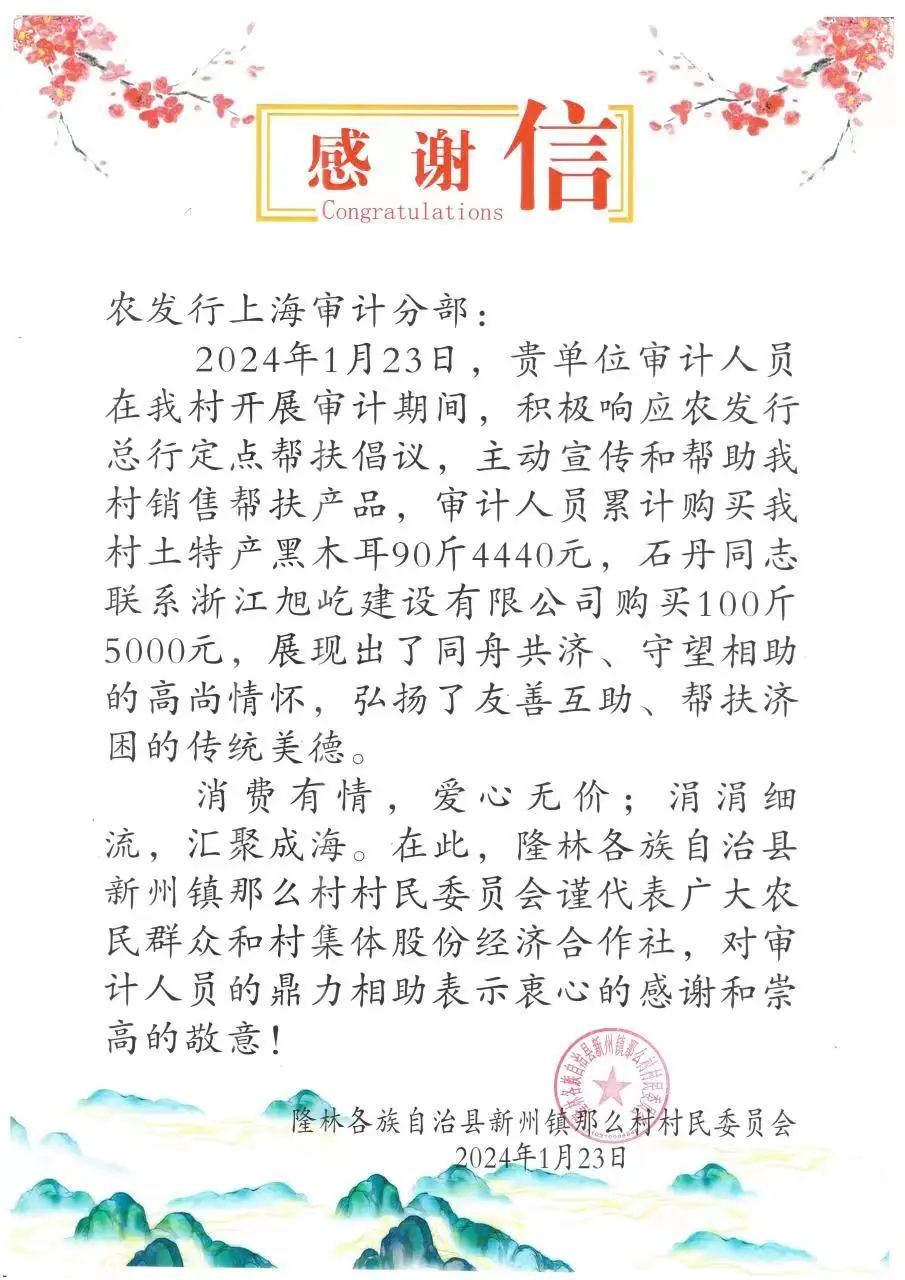 1月23日,上海審計(jì)分部在廣西隆林縣開展扶貧捐贈(zèng)資金使用情況專項(xiàng)審計(jì)期間,實(shí)地走訪那么村幫扶支持項(xiàng)目。那么村是廣西區(qū)分行定點(diǎn)幫扶村,主要產(chǎn)業(yè)為黑木耳種植。審計(jì)人員積極響應(yīng)總行定點(diǎn)幫扶倡議,熱心采購,共購買黑木耳90斤,金額合計(jì)4440元,以實(shí)際行動(dòng)支持扶貧工作。同時(shí),浙江審計(jì)辦石丹同志積極聯(lián)系家鄉(xiāng)企業(yè)——浙江旭屹建設(shè)有限公司購買黑木耳100斤,金額合計(jì)5000元。那么村村民委員會(huì)特發(fā)來感謝信,村民也自發(fā)制作刺繡表示感謝。