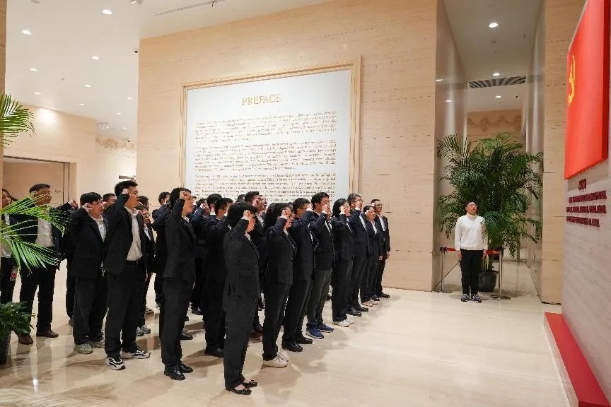 參觀結束后,在場館工作人員的引導下,大家再次重溫入黨誓詞。面對鮮紅的黨旗,分部總經理蘇靜帶領支部新老黨員一起高舉右手莊嚴宣誓。鏗鏘恢宏的誓詞,強烈震撼著在場的每一位黨員,一字一句,神圣而豪邁,體現了黨員同志們對中國共產黨的無限忠誠。