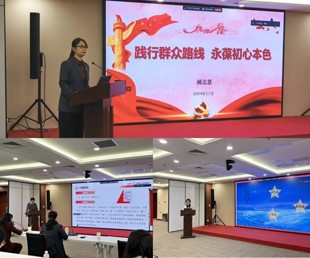 最后,第一黨支部代表以“‘匠·新’紅運(yùn) 智慧共營(yíng)”為主題宣講了支部黨建品牌“匠·新”,從創(chuàng)新精神、智慧運(yùn)營(yíng)和工匠精神三個(gè)維度深入解讀黨建引領(lǐng)樹(shù)“匠心”、健全機(jī)制鑄“匠器”、搭建平臺(tái)塑“匠藝”、真抓實(shí)干踐“匠行”、賦能成長(zhǎng)育“匠人”的品牌理念,以黨建品牌創(chuàng)建為抓手,鑄就一批運(yùn)營(yíng)集約改革精品工程,助力全行高質(zhì)量發(fā)展。青年工作代表以“青春向黨 ‘繁星’璀璨”為主題宣講了黨總支部青年工作品牌“繁星”,從代表指引的“追光星”、代表知識(shí)的“智慧星”和代表光芒的 “閃耀星”三方面介紹了“繁星”品牌內(nèi)涵,鼓勵(lì)年輕干部挑戰(zhàn)自我、表達(dá)觀點(diǎn)、展現(xiàn)才華。